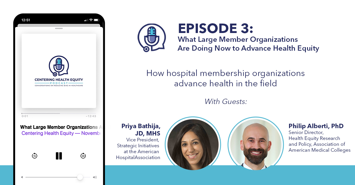 Recently, I had the honor of sitting down to record an episode of the "Centering Health Equity Podcast". A colleague from the AHA and I discussed some of the ways that membership orgs like AAMC & AHA are working to advance the contributions medical care can make toward eliminating population-level health inequities. Link: