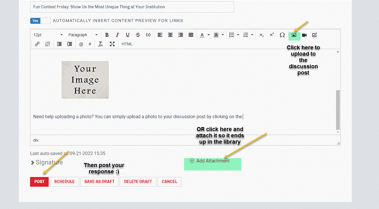Need help uploading a photo? You can simply upload a photo to your discussion post (First, click on the red "Reply button" on this discussion post) Next, click on the photo image on the right top corner of your discussion post, or click the "Add Attachment" button below. The primary difference is that attachments are added to the library, and using the top photo (or video) buttons will only post in the discussion thread.