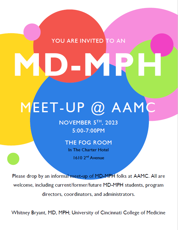 If you're in Seattle for AAMC, please consider dropping by this informal meet-up, open to all MD-MPH students/program directors/coordinators/administrators. Grab a drink from the bar and come meet your colleagues!