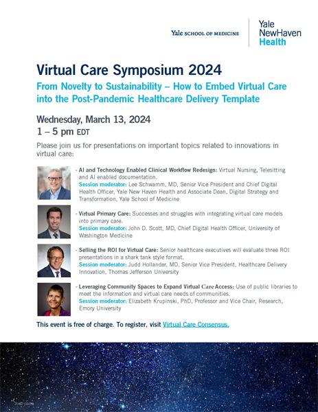 Yale New Haven Health System Hosting Virtual Care Symposium on March 13 from 1-5PM ET. Please see attached flyer for more details.